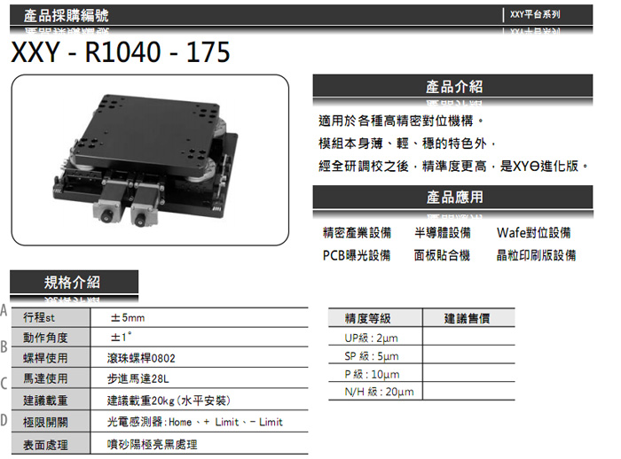 適用於各種高精密對位機構。模組本身薄、輕、穩的特色外,經調校之后,精准度更高,是XYθ進化版